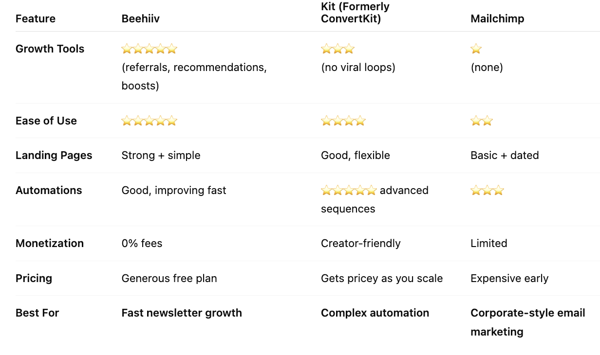Now let’s break down Beehiiv, Kit.com, and Mailchimp with that lens. The only lens that actually matters if your goal is fast, compounding newsletter growth.