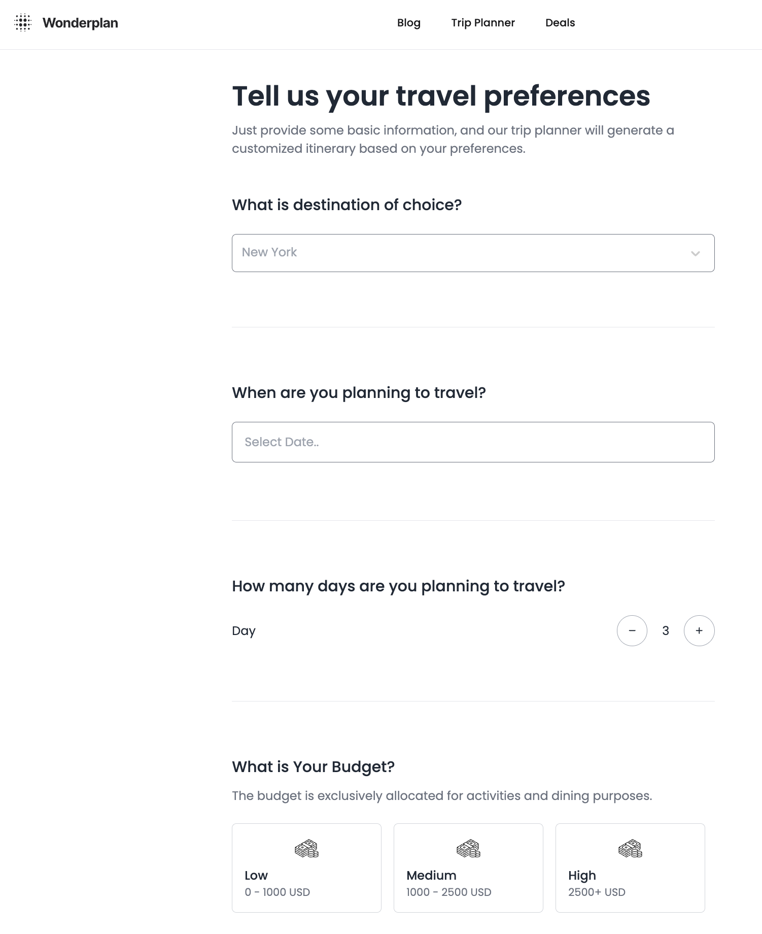 Wonderplan’s user interface, showing the custom travel preferences it asks
