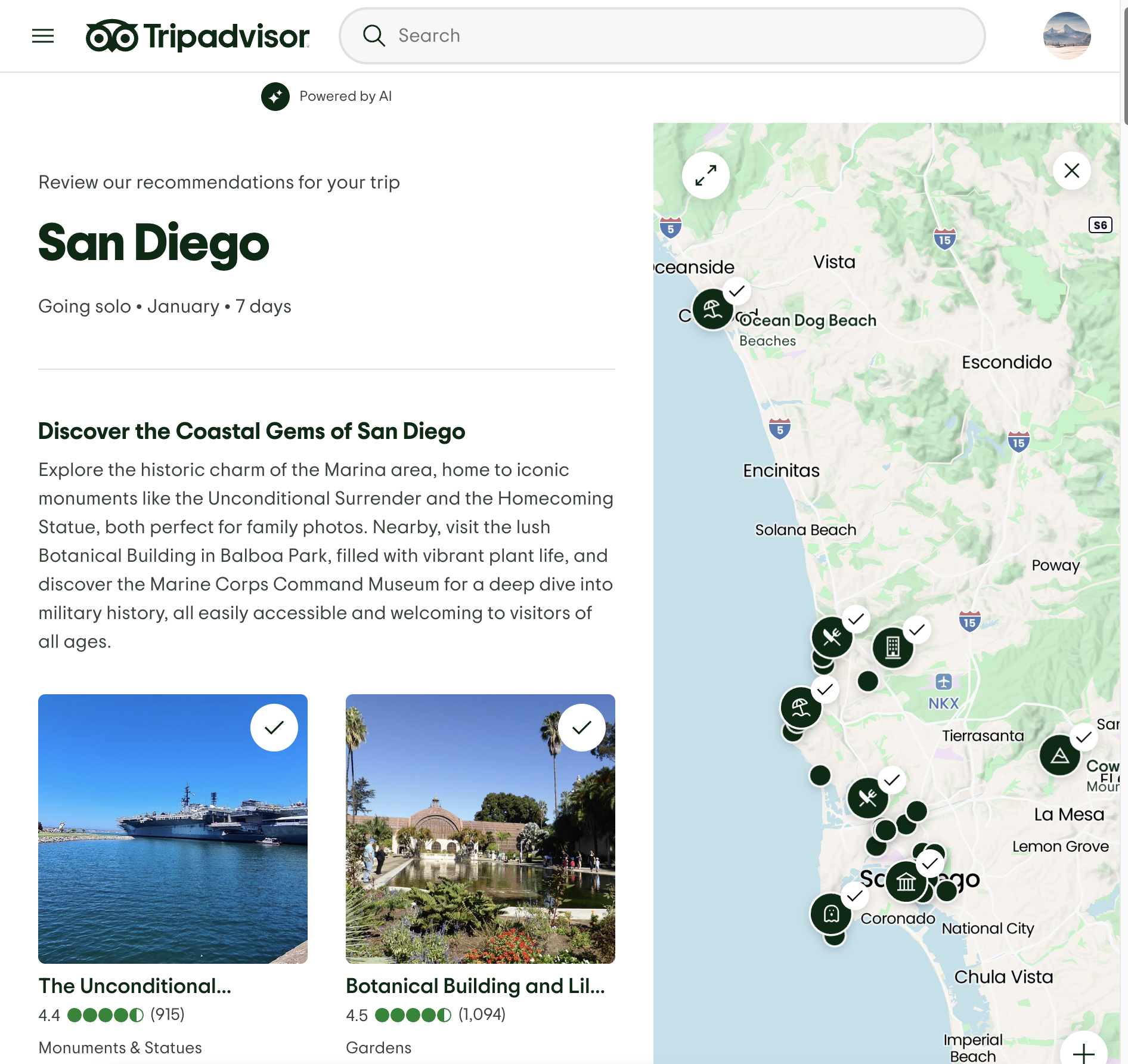 Tripadvisor launched its AI planner to help people build itineraries directly from its massive review database. It’s free, easy to access, and feels familiar if you already use Tripadvisor to research restaurants or tours. For this test, I fed it the exact same one-week Southern California winter road trip prompt. NOTE: I struggled to have it create the full SoCal itinerary from scratch, so instead I had it work on specific destinations.