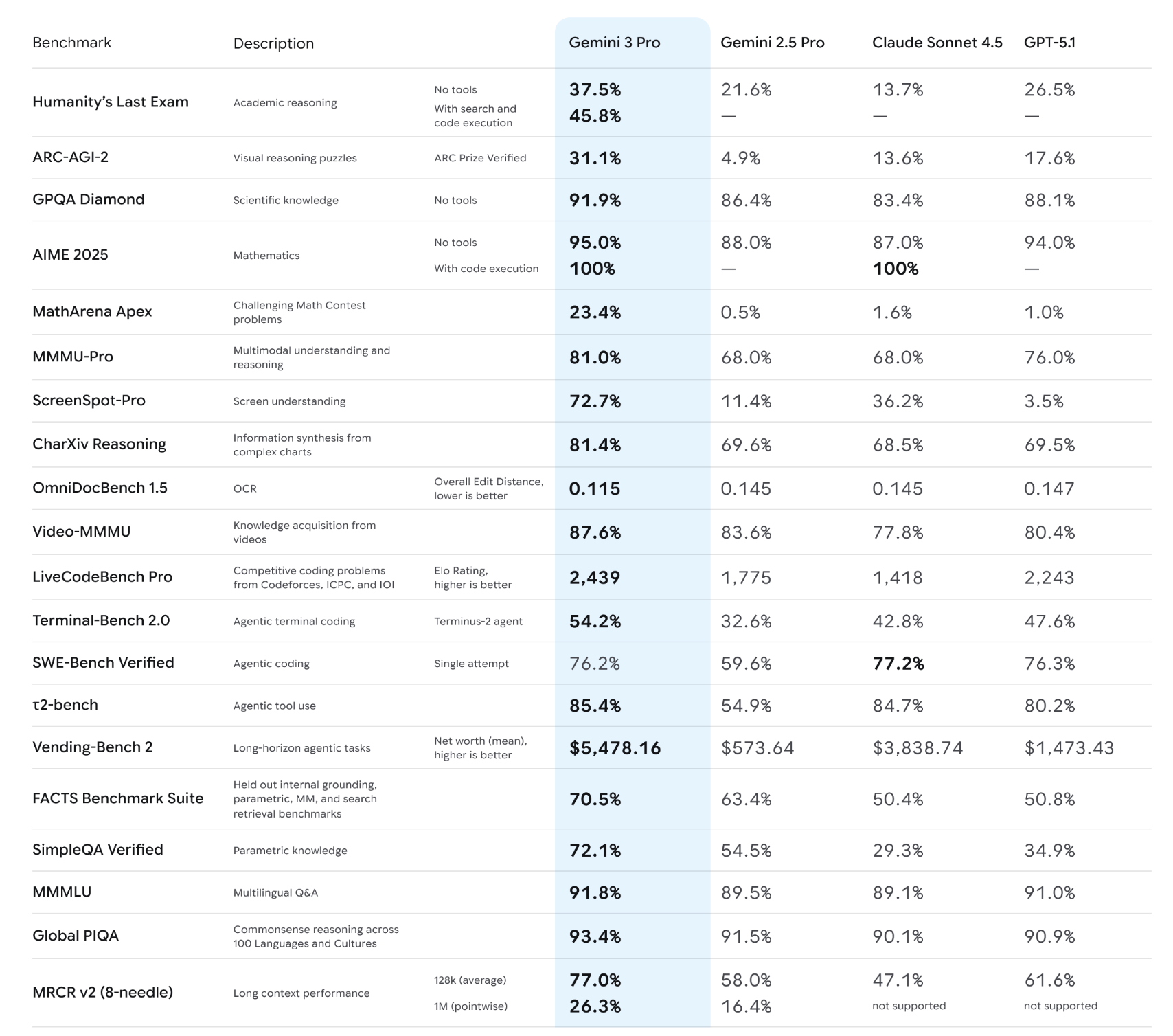 Gemini 3 Pro table showing AI benchmarks against ChatGPT and Claude / Credit: blog.google.com